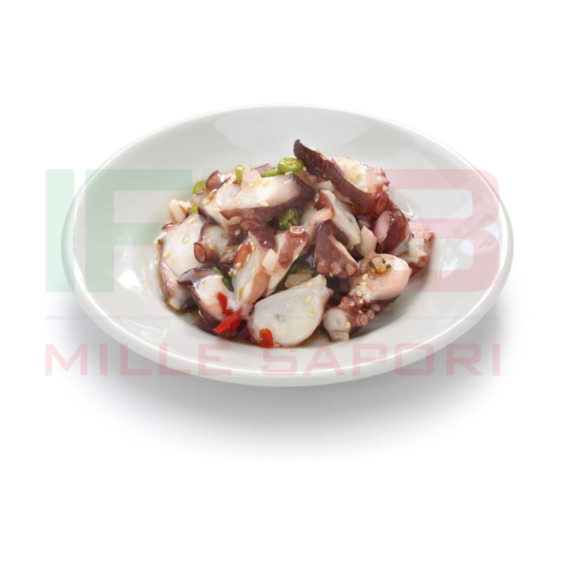 Skład: ośmiornice, woda, sól, stabilizatory (W501, E536,E450, E509), przeciwutleniacz: E338. Najlepiej spożyć przed: data ważności na metce. Produkt mrożony. Przechowywać w temp. -18C. Porozmrożeniu nie mrozić ponownie.